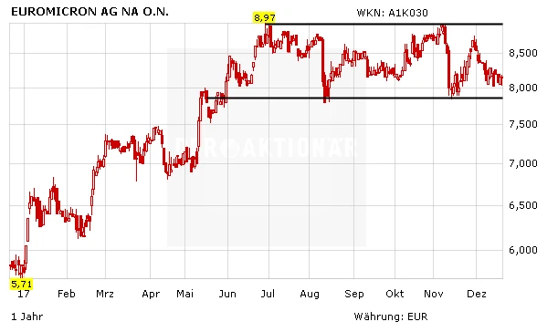 DER AKTIONÄR hält an seinem Fazit fest: Euromicron sollte gestärkt aus der Transformation hervorgehen und mit einer verbesserten Produktpalette sowie einer schlankeren Kostenstruktur wieder nachhaltig auf den Wachstumspfad zurückkehren. Die Aktie hat sich bereits von den Tiefstständen lösen können. Bei einem anhaltend positiven Newsflow dürfte die Aktie 2018 nachhaltig in zweistellige Kursregionen vorstoßen.