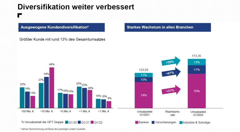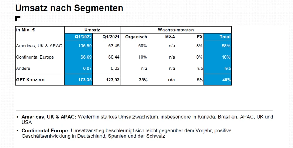 GFT Technologies steigerte die Umsätze im ersten Quartal um 40 Prozent auf 173,35 Millionen Euro. Im Sektor Versicherungen wuchsen die Umsätze um 67 Prozent, im Sektor Industrie & Sonstige um 59 Prozent. Im Sektor Banking lagen die Umsätze um 31 Prozent höher als im Vorjahreszeitraum.