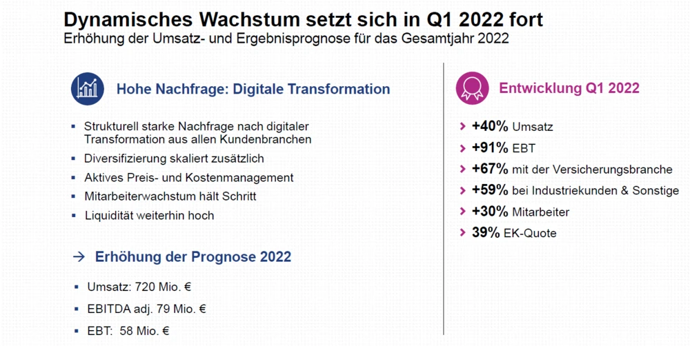 Dank des hohen Auftragseingangs wird Finanzvorstand Jochen Ruetz für den Rest des Jahres optimistischer: Der CFO erwartet nun ein Umsatzwachstum um 27 Prozent auf rund 720 Millionen Euro (bisher: 680 Millionen Euro; 2021: 566,19 Millionen Euro). Das bereinigte EBITDA wird voraussichtlich um 22 Prozent auf etwa 79 Millionen Euro anwachsen.