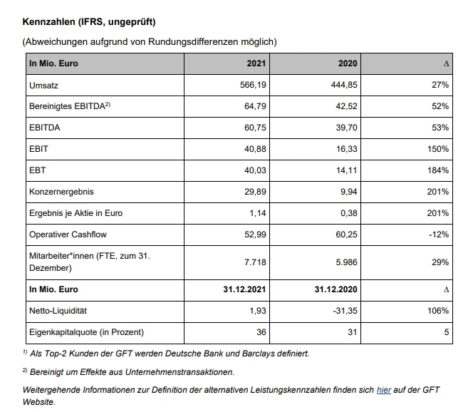 Für das laufende Jahr erwartet GFT, dass die sehr positive Entwicklung anhält. So soll der Umsatz um 20 Prozent auf rund 680 Millionen Euro anwachsen, das Ergebnis vor Steuern um 36 Prozent auf 54,5 Millionen Euro. Daraus resultiert eine EBT-Marge von 8,0 Prozent, die damit leicht über der Prognose vom 21. Oktober 2021 liegt, die eine Marge von 7,5 Prozent vorsah.
