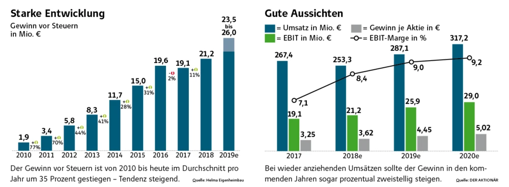 Unterm Strich stand ein Gewinn je Aktie von 3,62 Euro (Vorjahr: 3,25 Euro). Dieser Trend sollte 2019 anhalten. Der Vorstand strebt eine weitere Ergebnissteigerung mit einem Ergebnis vor Steuern (EBT) in der Bandbreite von 23,5 bis 26,0 Millionen Euro an. DER AKTIONÄR erwartet ein EBT am oberen Ende des Zielkorridors.
