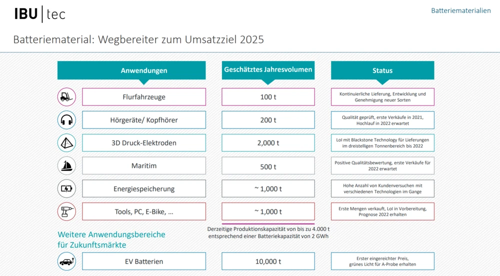 AKTIONÄR-Leser wissen: Der Fokus bei IBU-tec liegt auf den Batteriematerialien für den Einsatz in Lithium-Eisenphosphat(LFP)-Zellen. Bis zum Jahr 2025 sollen in dem Kernsegment bis zu 30 Prozent des Gesamtumsatzes des Konzerns erwirtschaftet werden. Ebenfalls positiv: IBU-tec hat noch mehr zu bieten, die Produktpalette reicht von chemischen Katalysatoren für Medikamente (Blutdrucksenker) und dem Recycling von hochwertigen Metallen über die genannten Batteriematerialien bis hin zur Beschichtung von Pfandflaschen (Glasscoating). Im Gesamtkonzern wird für das Jahr 2025 mit Umsätzen von 80 bis 100 Millionen Euro geplant, bei einer EBITDA-Marge von über 20 Prozent.