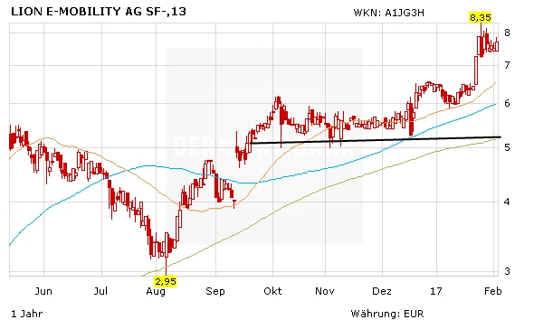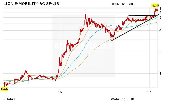 Die Aktie hat sich seit der Empfehlung in Ausgabe 51/2016 in der Rubrik Hot Stock zu einem Kurs von 5,60 Euro gut entwickelt. Mehr zu Lion, Norcom, Aumann und IBU-Tec sowie dem Trend Elektromobilität gibt es in der aktuellen Ausgabe des AKTIONÄR.