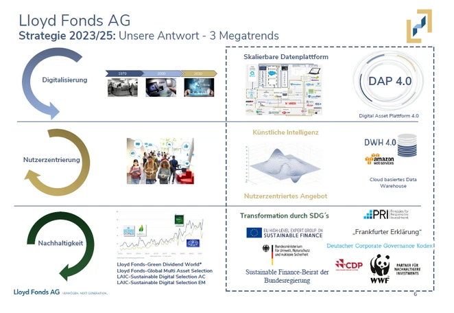 Besonders interessant: Dem Ziel, bis 2024 einer Marge von 45 Prozent zu erreichen, ist die Gesellschaft mit aktuell 43 Prozent schon jetzt sehr nah gekommen. An den mittelfristigen Planvorgaben hält der Firmenlenker aber vorerst fest: „Für die Umsetzung unserer Strategie 2023/25 streben wir mittelfristig neben dem weiteren organischen und anorganischen Wachstum der AuMs auf sieben Milliarden Euro als zweites Ziel die Erreichung einer EBITDA-Marge von über 45 Prozent auf den Nettoumsatz des Lloyd Fonds-Konzerns bis Ende 2024 an.“