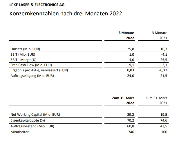 „Nach einem herausfordernden Jahr 2021 sind wir zurück auf Wachstumskurs“, so Vorstand Klaus Fiedler. Der Umsatz stieg im ersten Quartal um 59 Prozent auf 25,8 Millionen Euro, wobei alle Segmente zum Wachstum beigetragen haben. Das Ergebnis vor Zinsen und Steuern (EBIT) erreichte 1,0 Millionen Euro nach einem Verlust von 4,1 Millionen Euro im Vorjahr. Damit hat der Laserspezialist den oberen Rand der Quartalsprognose erreicht, die einen Umsatz zwischen 22 und 26 Millionen Euro sowie ein EBIT von minus zwei bis plus eine Million Euro vorhersah.