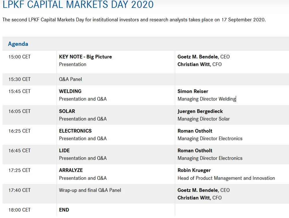 Die beiden Vorstände Dr. Götz Bendele (CEO) und Christian Witt (CFO) werden dazu erklären, wie das Unternehmen die aktuelle Lage beurteilt und seine mittelfristigen Ziele erreichen will, wie man mit Corona umgeht und was es an Produktneuheiten gibt, darunter auch die Arralyze als Anwendung der neuen LIDE-Technologie im Laborumfeld. Zudem gibt es Präsentationen aus den anderen Geschäftsfeldern.
