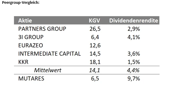 Im Bewertungsvergleich mit anderen Private-Equity-Häusern wird die Unterbewertung von Mutares zusätzlich deutlich. Bezogen auf das KGV ist die Branche im Schnitt mehr als doppelt so hoch bewertet. Bei der Dividendenrendite stechen die Münchener ebenso positiv hervor.