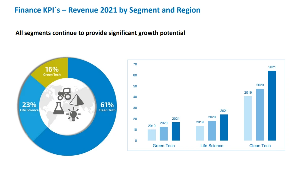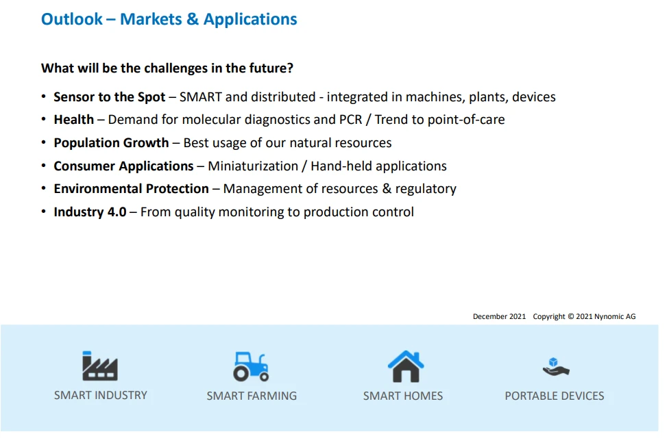 Nynomic verfügt über eine breite Aufstellung – sowohl produktseitig als auch geografisch. Das operative Geschäft ist dabei in drei wachstumsstarke Segmente aufgeteilt. Der größte Bereich „Clean Tech“ unterstützt den gesamten Industriesektor bei der Produktionskontrolle. „Life Science“ umfasst die Lösungen für die Medizintechnik unter anderem zur Analyse von Blut oder Medikamenten. Im „Green Tech“-Segment sind Anwendungen aus der Landwirtschaft wie die Bodennährstoff- und Pflanzenüberwachung (Smart-Farming-Sensorsysteme), die Analyse von Getreide bei der Saat und die Umwelttechnik zusammengefasst.
