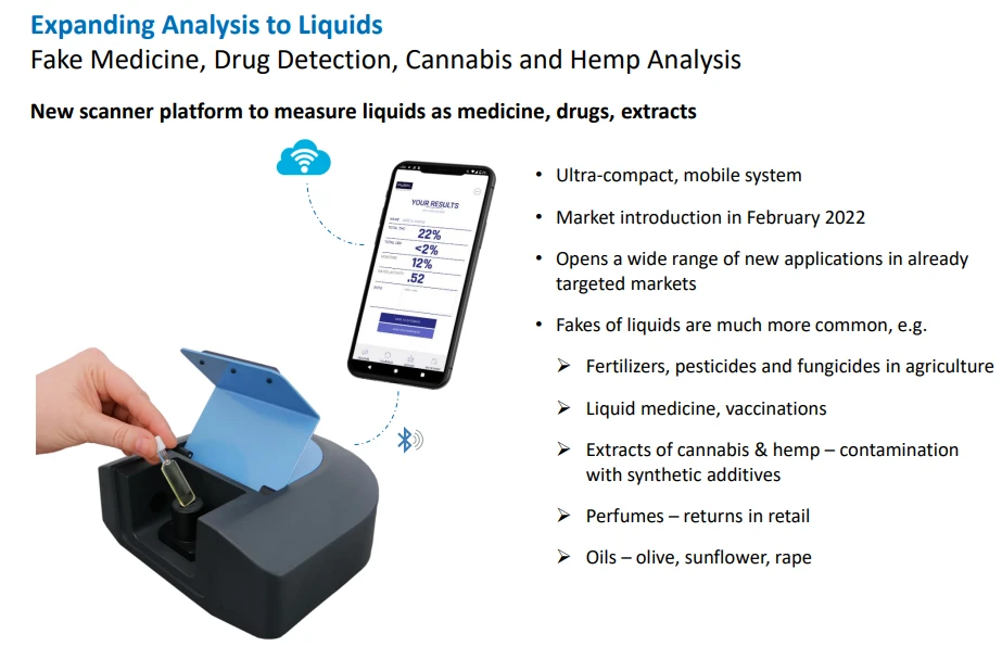 Neben dem Bereich „Fake Medicine“ sorgen unter anderen der internationale Roll-out des „TactiScan“-Handhelds zur Rauschmittelerkennung sowie die steigende Nachfrage nach dem Cannabis-Messgerät „Purpl PRO“ für zusätzliche Fantasie.