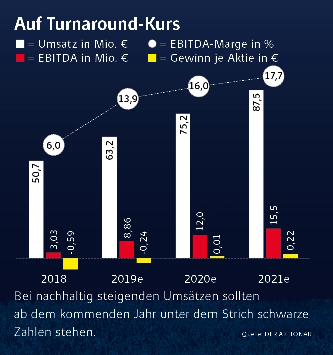 Der Track-Rekord des noch jungen Hidden Champions kann sich schon jetzt sehen lassen. Der Umsatz ist in den vergangenen fünf Jahren im Durchschnitt um 25 Prozent pro Jahr gewachsen. Im Vorjahr gab es eine kleine Wachstumsdelle, nachdem Großkunde Gilead die Zahl der Bestellungen reduzieren musste. Für 2018 stand daher ein Wachstum von „nur“ acht Prozent zu Buche. Zu hohe Kosten halbierten das EBITDA auf 3,2 Millionen Euro. Unterm Strich standen rote Zahlen.