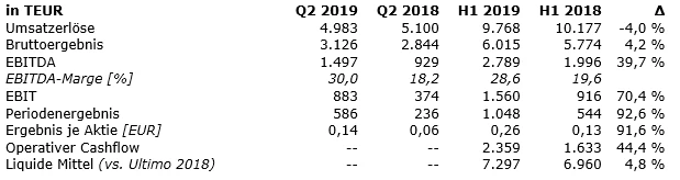 Weniger erfreulich entwickelten sich indes die Umsätze im ersten Halbjahr 2019. Vita 34 verzeichnete einen Rückgang um vier Prozent auf 9,8 Millionen Euro. Die Gesellschaft begründet dies mit dem zuvor kommunizierten Vertriebspartnerwechsel. Allerdings habe die positive Entwicklung in der DACH-Region jedoch dazu geführt, dass die Umsatzerlöse im zweiten Quartal bereits nahezu auf Niveau des Vergleichsquartals des Vorjahres lagen.