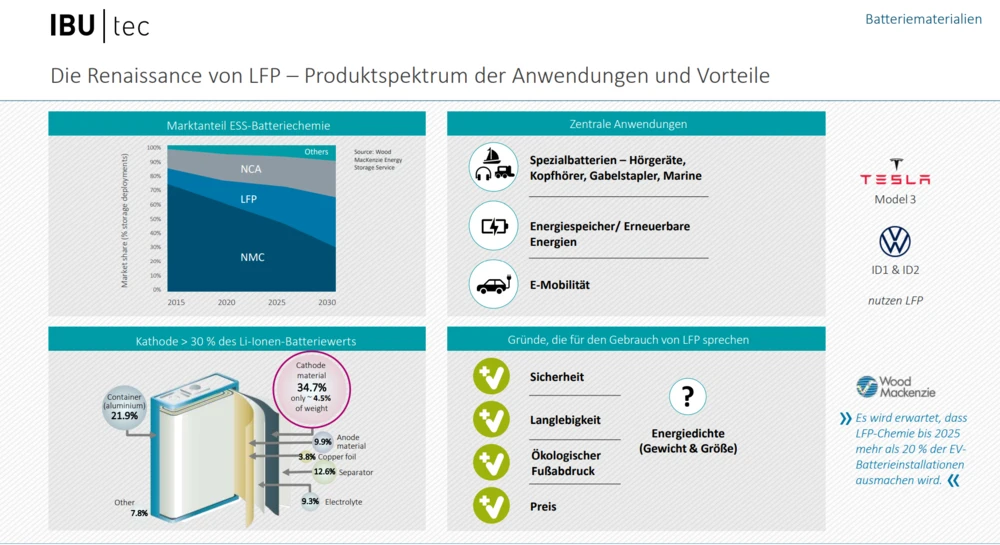 Im Oktober kündigte Tesla an, die Fahrzeuge mit Standardreichweite auf Akkus, die auf Lithium-Eisenphospat (LFP) basieren, umzustellen. Das notwendige Batteriematerial dafür bezieht der E-Auto-Pionier derzeit (noch) aus Asien. Andere Hersteller wie Mercedes oder Volkswagen haben den Einsatz von LFP-Akkus ebenfalls angekündigt. Ein Trend, von dem am Ende auch IBU-tec profitieren dürfte.