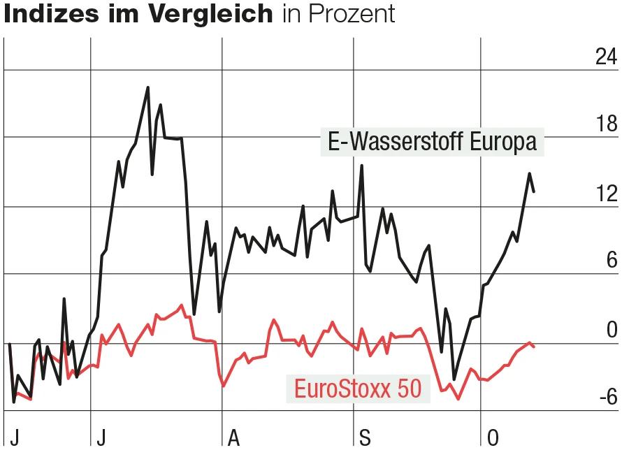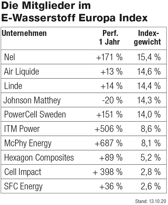 Wasserstoffspezialisten wie McPhy, ITM Power oder Cell Impact gehören zu den absoluten Highflyern im laufenden Börsenjahr. Nach einer Verschnaufpause nimmt der Hype nun wieder Fahrt auf. Die Bewertungen bleiben zwar immens hoch, doch die Hoffnung auf eine Dekarbonisierung der Industrie und die Chancen bei der Anwendung in der Mobilitätsbranche sorgen für weiter steigende Kurse. Der E-Wasserstoff Europa Index nähert sich entsprechend seinem Rekordhoch aus dem Juli.