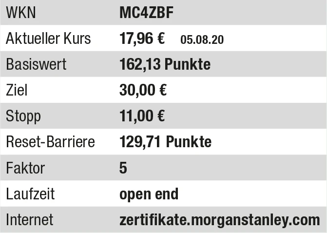 Trotz des jüngsten Rücksetzers befindet sich der Save the World Index in einem intakten Aufwärtstrend. Seit dem März-Tief hat sich der Index mittlerweile mehr als verdoppelt. Auch das kürzlich aufgestellte Allzeithoch ist wieder zum Greifen nahe, insgesamt muss der Index hierzu nur rund sieben Prozent zulegen. DER AKTIONÄR hat in der Ausgabe 20/2020 ein Long-Zertifikat mit der WKN MC4ZBF und Faktor 5 auf den Save the World Index empfohlen. Seit der Empfehlung hat der Schein in der Spitze knapp 400 Prozent zugelegt. Aktuell beträgt das Kursplus rund 230 Prozent. DER AKTIONÄR passt nun erneut den Ziel- und Stoppkurs an. Neues Ziel: 30,00 Euro. Neuer Stopp: 11,00 Euro.
