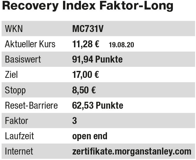 Die Coronakrise hat deutliche Spuren an den Börsen hinterlassen. Unternehmen, deren Chinageschäft einen hohen Anteil am Gesamtumsatz ausmacht, sowie Luxusgüterhersteller und die Reise- und Touristikbranche wurden besonders gebeutelt. Um auf einen Turnaround betroffener Qualitätsunternehmen zu setzen, hat DER AKTIONÄR den Recovery Index aufgelegt. Dieser bündelt 15 Comeback-Aspiranten mit überproportionalem Aufwärtspotenzial. Er bietet Produkte für konservative, spekulative und risikobereite Anleger.
