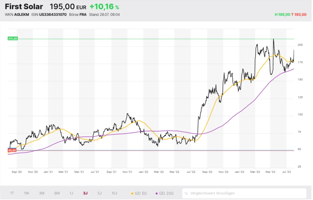 Die Aktie zeigt weiterhin eine beeindruckende Stärke im Solar-Sektor. Seit Anfang des Jahres hat die Aktie knapp 40 Prozent zugelegt. Das Chartbild ist weiterhin blitzsauber – die Aktie hat jüngst die 200-Tage-Linie erfolgreich verteidigt. First Solar ist seit Ende November mit Kursziel 250 Euro und Stopp 148 Euro eine Empfehlung von DER AKTIONÄR. Anleger, die der Empfehlung gefolgt sind, erfreuen sich über Kursgewinne von 25 Prozent.