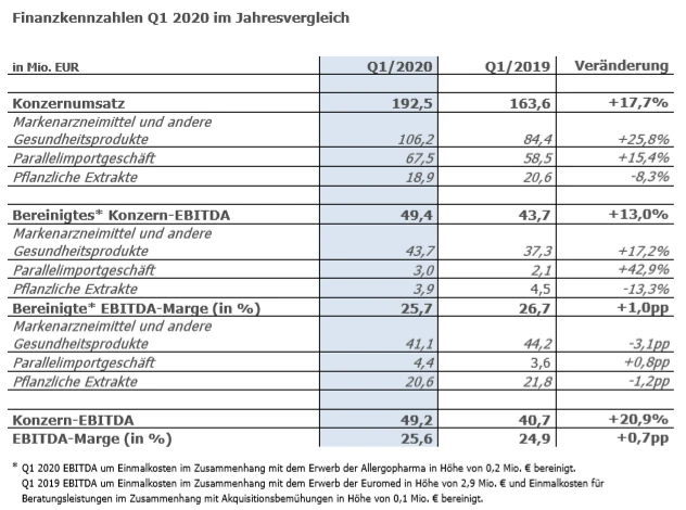 Der Umsatz des Herstellers von patentfreien Markenarzneimitteln stieg im ersten Quartal um 17,7 Prozent auf 192,5 Millionen Euro. Beim bereinigten EBITDA verzeichnete das Unternehmen einen Zuwachs von 13,0 Prozent auf 49,4 Millionen Euro.