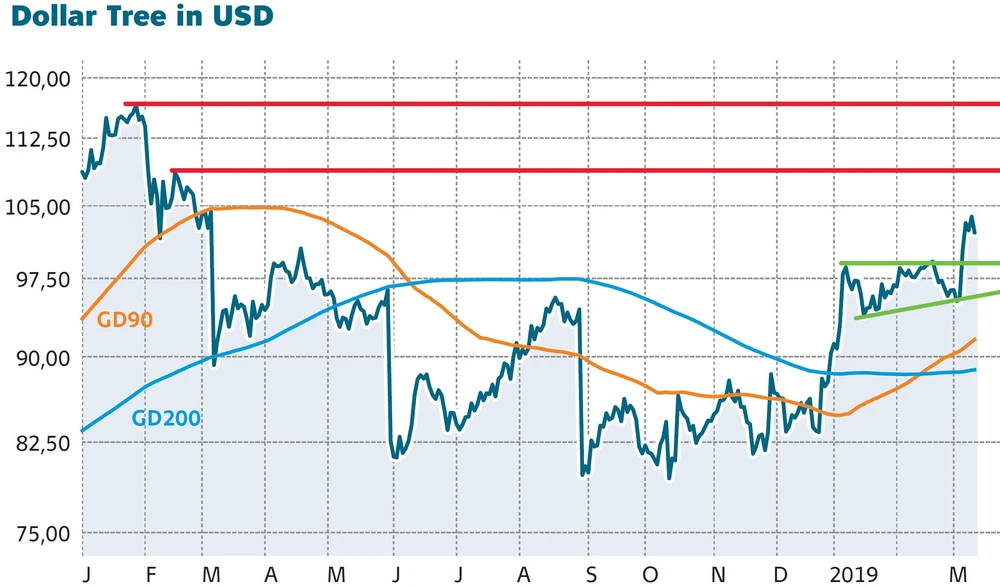 Zuletzt meldete Dollar Tree gute Zahlen für das vierte Quartal. Der bereinigte Gewinn je Aktie kletterte auf 1,92 Dollar. Die Analysten hatten mit einem Cent weniger gerechnet. Die Umsätze der seit mindestens einem Jahr geöffneten Filialen stiegen um 2,4 Prozent (Prognose: 1,5 Prozent).