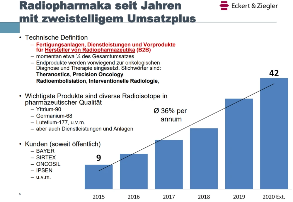 Als Spezialist für isotopentechnische Anwendungen in Medizin, Wissenschaft und Industrie bleibt Eckert & Ziegler im ambitioniertem Umfeld damit auf Kurs. Das Unternehmen zählt zu den größten Profiteuren der steigenden Nachfrage nach Radiopharmazeutika, vor allem nach dem Radioisotop Gallium-68 zur Lokalisierung und Behandlung von Tumoren. Der Gallium-68-Generator der Gesellschaft ist extrem kosteneffizient. Als Teil eines Duopols kann Eckert & Ziegler von Vorteilen bei der Preisbildung profitieren. Neben dem Gallium-68-Generator hat die Gesellschaft noch eine Reihe von anderen „heißen Eisen“ im Feuer. Anstehende Indikationserweiterungen durch die großen Pharmakonzerne sollten bei dem Zulieferer der benötigten Radionuklide daher mittelfristig zu einer überproportional steigenden Nachfrage führen.