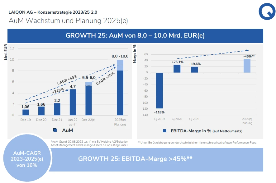 Der organische AuM-Zuwachs im zweiten Halbjahr 2022 von rund 25 Prozent resultiert aus der sehr positiven Entwicklung mehrerer Wachstums- und Vertriebsinitiativen in allen Geschäftsfeldern. Zu nennen ist hier einerseits der AuM-Anstieg aus der erwarteten Aufstockung bzw. Neugewinnung von aktiven Spezialmandaten um mehr als 500 Millionen Euro bis zum Jahreswechsel, die Gewinnung von Family Office Mandaten der Vermögensverwaltung Lange Assets & Consulting GmbH über 100 Millionen Euro und Zuflüsse bei LAIC von 60 Millionen Euro. Andererseits wird die Konsolidierung unserer Beteiligung an dem Robo Advisor growney GmbH mit rund 330 Millionen Euro im Dezember 2022 erwartet. Zusätzlich wird der Zuwachs aus positiver Performance in allen Wealth Produkten und Lösungen mit über 100 Millionen Euro erwartet. Für das Gesamtjahr 2022 erreichen wir somit ein aus organischem und anorganischem Wachstum kumulierten Anstieg von 166 Prozent.