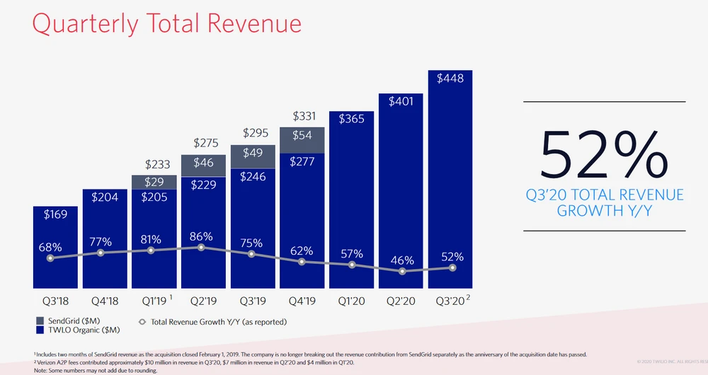 Insgesamt erzielte Twilio einen Gewinn pro Aktie von 4 Cent. Erwartet wurde ein Verlust von vier Cent. Der Umsatz konnte um 52 Prozent auf 448 Millionen Dollar gesteigert werden (der Konsens lag bei 407 Millionen).