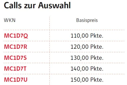 Bislang hatten Anleger, die von der starken Performance des Titan-Index profitieren wollten, lediglich die Wahl zwischen Mini-Futures und Faktor-Zertifikaten. Doch seit Kurzem gibt es auch klassische Call-Optionsscheine auf den Index. Bei einer Laufzeit bis Mitte Dezember reicht die Spanne der Basispreise von 110 bis 150 Punkten.