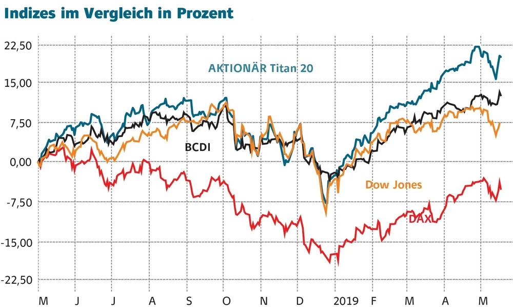 Der Vergleichschart oben zeigt: Der Titan-Index hat in den vergangenen zwölf Monaten deutlich besser abgeschnitten als DAX und Dow Jones. Auch der Mitbewerber, der BCDI Index, kann da nicht annähernd mithalten. Während der DAX ein Minus verzeichnet hat, kommt der Titan-Index auf ein stolzes Plus von knapp 20 Prozent.