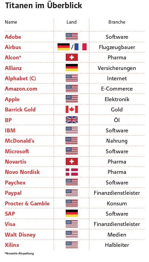 Ausnahmsweise zählt der Titan-Index aktuell 21 Mitglieder, wobei die Erklärung recht einfach ist. Im April hat der Schweizer Pharmakonzern Novartis seine Augenheil-Sparte Alcon abgespalten und als eigenständiges Unternehmen an die Börse gebracht. Bei dem Spin-off bekamen Anleger die Alcon-Aktien automatisch eingebucht, im Index wurde genauso verfahren. Bei der regelmäßigen Überprüfung Ende des zweiten Quartals wird der Titan-Index dann wieder auf die regulären 20 Werte zurückgesetzt.