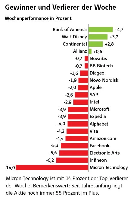 Gerade aus denjenigen Werten, die den Index zuletzt nach oben getragen haben, fließt augenscheinlich Kapital ab. Auf der Verliererseite mit teils deutlichen Rücksetzern befinden sich Infineon und Micron Technology. Vor allem Letztere sticht mit einem Wochenminus von 14 Prozent negativ hervor. Eine kritische Branchenstudie der US-Bank Morgan Stanley hat den gesamten Halbleitersektor unter Druck gebracht. Laut Morgan Stanley werden sich die Nachfragezyklen für Speicherchips abschwächen, was entsprechende Risiken für das Gewinnwachstum der Branche mit sich bringt. Ein Bereich, der vor allem für Micron relevant ist.