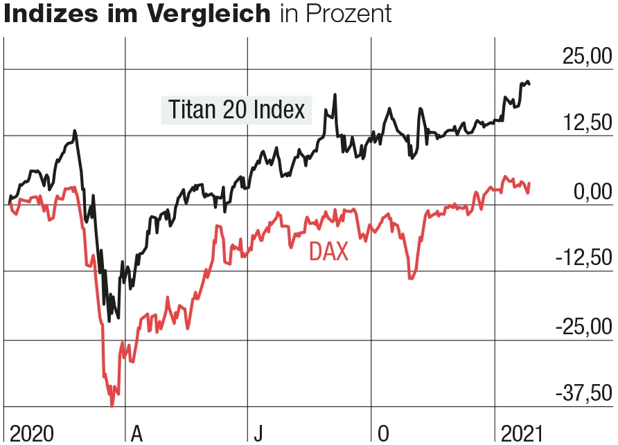 Der Titan 20 macht seinem Namen alle Ehre. Trotz der Angst vor dem mutierten Coronavirus klettert der Index weiter nach oben und markierte am Montag sogar ein neues Rekordhoch bei 183,12 Punkten. Im Gegensatz zum Benchmark-Index DAX, der seit dem Jahreswechsel in einer Konsolidierungsphase feststeckt, bewegt sich der Titan weiterhin in einem steilen Aufwärtstrend.