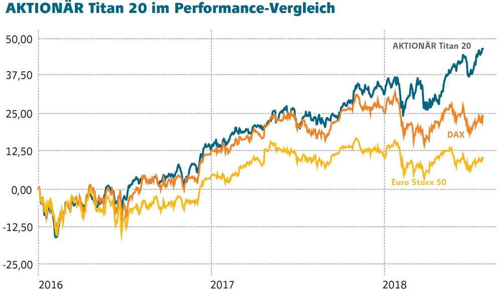 Und die Fakten sprechen ganz klar für den aktionär Titan 20 Index. Seit Auflegung am 4. Januar 2016 hat das Kursbarometer einen Wertzuwachs von 37,6 Prozent verbucht. Die Benchmark, der DAX, hat im gleichen Zeitraum lediglich 19,3 Prozent geschafft. Der Euro Stoxx 50 kommt sogar nur auf 17,5 Prozent und damit nicht einmal auf die Hälfte.
