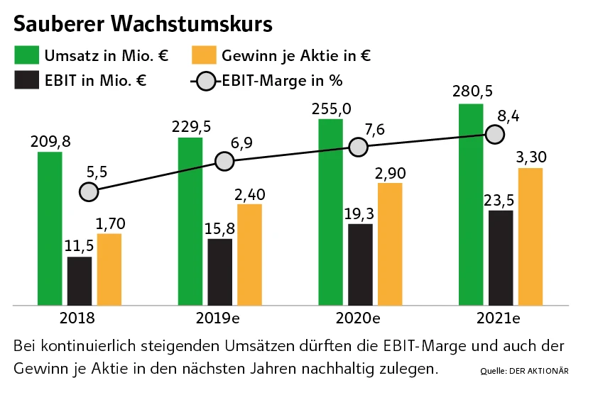 Viel wichtiger als die kurzfristige Entwicklung sind die mittelfristigen Aussichten. In den kommenden Jahren sollen die Umsätze jeweils um zehn Prozent zulegen – bei nachhaltig steigenden Margen. Als mittelfristiges Ziel steht eine Umsatzsteigerung bis 2024 auf 300 Millionen Euro und eine EBIT-Marge von rund zehn Prozent auf der Agenda. Stellt sich der Nachfragewechsel von biogas- auf erdgasbetriebene Anlagen in den Jahren 2020/21 wie geplant ein und forciert die Regierung den Einsatz von KWK-Lösungen zur Stromnetzstabilität, dürfte sich diese Prognose vermutlich als deutlich zu konservativ erweisen.