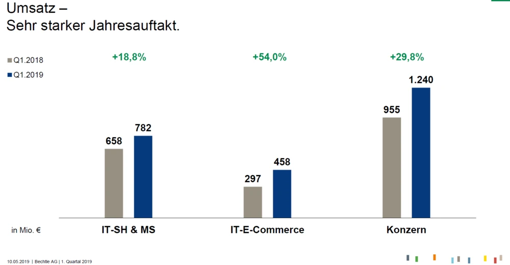 „Die Entwicklung im ersten Quartal war wirklich beeindruckend", so ein sichtlich zufriedener Bechtle-Vorstandschef Thomas Olemotz. Der Umsatz stieg in den ersten drei Monaten im Vergleich zum Vorjahr um 30 Prozent auf 1,24 Milliarden Euro. Aber auch ohne Übernahme wären die Schwaben kräftig gewachsen – der Konzern bezifferte das organische Wachstum auf 15 Prozent. Das Vorsteuerergebnis legte um 27 Prozent auf 45 Millionen Euro zu. Unterm Strich stand ein Gewinn von knapp 31,7 Millionen Euro (Vorjahr: 24,8 Millionen Euro).