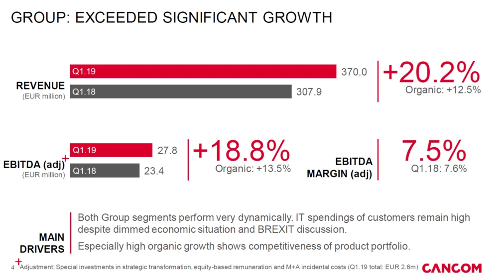 An diesen Trend knüpfte die Gesellschaft in den ersten drei Monaten 2019 nahtlos an. Die Erlöse zogen um rund ein Fünftel auf 370 Millionen Euro an. Dabei stieg der Umsatz im Cloud-Segment mit rund 28 Prozent besonders stark an. Der bereinigte operative Gewinn legte hier um knapp ein Drittel zu. Bei den IT-Lösungen betrug der Umsatzanstieg knapp 19 Prozent, der operative Gewinn stieg um rund acht Prozent.