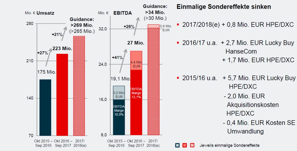 Zur Erinnerung: Mittelfristig will die Gesellschaft den Umsatz auf 500 Millionen Euro steigern – rund 350 Millionen davon entfallen auf organisches Wachstum, den Rest sollen Zukäufe beisteuern. Die Marge soll im selben Zeitraum auf über 13 Prozent beim EBITDA und rund zehn Prozent beim EBIT steigen. Angesichts der zuletzt generierten margenstarken Outsourcing-Verträge scheint dies eine recht konservative Planung.