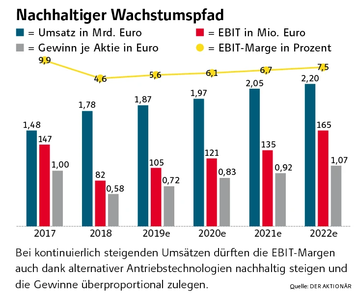 Die Rechnung bei Deutz ist recht simpel. Dank einer hohen Kapazitätsauslastung sollte die EBIT-Marge weiter nachhaltig steigen. Ergebnis: Das KGV fällt 2020 in den einstelligen Bereich und die Aktie steigt in zweistellige Kursregionen.