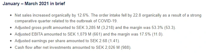 Der Nettoumsatz stieg demnach organisch um 12,6 Prozent auf 6,17 Milliarden Schwedische Kronen (0,61 Milliarden Euro). Dank signifikanter Margenverbesserungen schnellte das Ergebnis je Aktie von 1,41 Kronen im Vorjahreszeitraum auf 2,68 Kronen (0,27 Euro) nach oben.