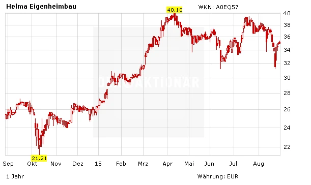 DER AKTIONÄR spekuliert im Real-Depot bereits seit Anfang des Jahres auf steigende Kurse bei Helma Eigenheimbau. Mit Erfolg: die Position liegt aktuell bereits über 25 Prozent vorne.