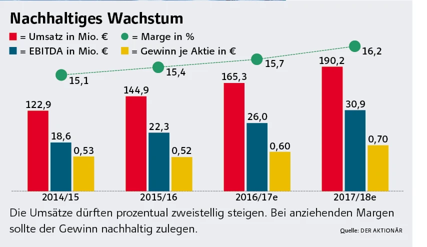 Daran sollte sich im laufenden Jahr nichts ändern. In Zahlen ausgedrückt sieht Musso den Umsatz Ende September 2017 bei 160 Millionen Euro und das EBIT bei 25 Millionen Euro. Da das Unternehmen für seine eher konservativen Ausblicke bekannt ist, dürften die tatsächlichen Zahlen nach Schätzungen des AKTIONÄR noch ein wenig besser ausfallen. Auch die mittelfristigen Aussichten sind gut: In Zukunft will der Vorstand die Strategie der Internationalisierung, der Innovation und der Industrialisierung konsequent weiterverfolgen. „Der deutsche Heimatmarkt wird bereits deutlich dominiert und nun gilt es diese Kompetenzen weiter im Ausland zu beweisen. Neben einem bereits starken Geschäft in der Schweiz und der Expansion in die Benelux-Region hat die KPS AG jüngst auch die Saphira Consulting, ein dänisches Unternehmen, übernommen. Somit ist mit einem stärkeren skandinavischen Fokus in der Zukunft zu rechnen“, so GBC-Experte Greiffenberger.