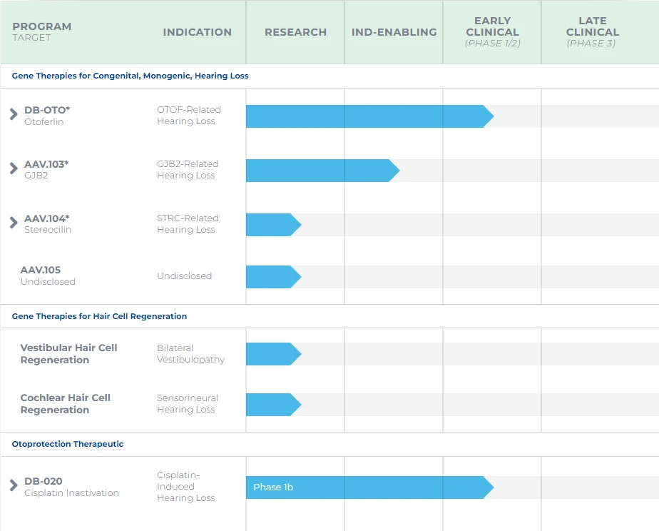 "DB-OTO, unsere gemeinsame Gentherapie, wird bald in ihrer ersten klinischen Studie Patienten erreichen und Kindern mit dieser seltenen Form der angeborenen Schwerhörigkeit eine neue Perspektive bieten sowie einen potenziellen Konzeptnachweis für künftige Gentherapien, die sich mit häufigeren Formen der genetischen Schwerhörigkeit befassen."
