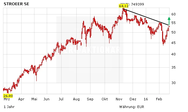 Offiziell hat Ströer-Vorstand Müller erst Mitte Januar seine Strategie bestätigt. Dabei erklärte der Firmenlenker, das Geschäftsjahr 2015 mit einem EBITDA von etwas über 200 Millionen Euro sogar besser als bisher prognostiziert abgeschlossen zu haben. Doch damit nicht genug: Aus der Firmenzentrale ist zu hören, dass der Start ins neue Jahr sehr gut verlaufen ist – sowohl im Digital-Segment als auch in der Außenwerbung. Demnach stehen für alle Geschäftsbereiche zweistellige organische Wachstumsraten zu Buche. DER AKTIONÄR erwartet für 2015 einen Umsatz in Höhe von 830 Millionen Euro sowie einen Gewinn je Aktie von 2,07 Euro.