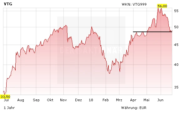 Kaufinteressenten gibt es dem Vernehmen nach einige. Sollte die Übernahme nun reibungslos verlaufen, scheint bei VTG eine Anhebung des Ausblicks im weiteren Jahresverlauf möglich. Anleger können daher Kurse unter 50 Euro zum Auf- oder Ausbau einer Position nutzen.