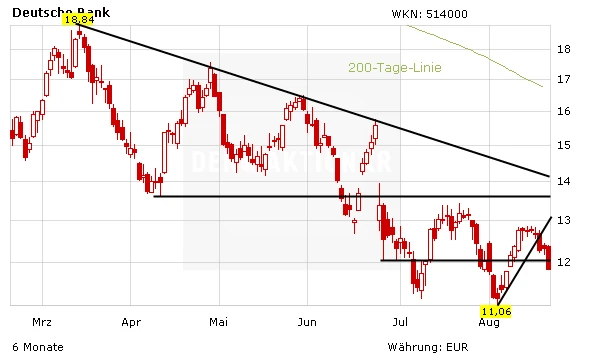 Die charttechnische Situation bei der Deutschen Bank hat sich am Freitag weiter eingetrübt. Die Aktie kann ihre anfänglichen Gewinne nicht halten und rutscht weiter unter die Unterstützung bei zwölf Euro und damit unter den kurzfristigen Aufwärtstrend. Damit entfernt sie sich auch weiter von dem seit März gültigen Abwärtstrend, der aktuell knapp oberhalb von 14 Euro verläuft. Kommt nicht schnell eine Gegenreaktion, könnte die Aktie sogar in Kürze das Allzeittief bei 11,06 Euro angehen.