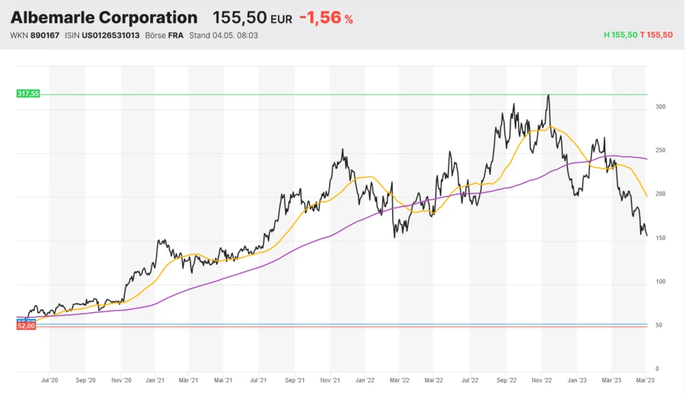 Das einzige Haar in der Suppe sind die Prognose-Senkungen für das laufende Jahr seitens der Unternehmensführung. Der Gesamtjahresumsatz wurde von der zuvor kommunizierten Bandbreite von 11,3 bis 12,9 Milliarden Dollar auf nun 9,8 bis 11,5 Milliarden gesenkt. Das gleiche Bild beim Gewinn je Aktie, dieser wurde von 26 bis 33 Dollar pro Aktie auf 20,75 bis 25,75 Dollar gesenkt. Grund für diesen schwächeren Ausblick seien die nachgebenden Lithium-Preise, so der CEO Kent Masters.