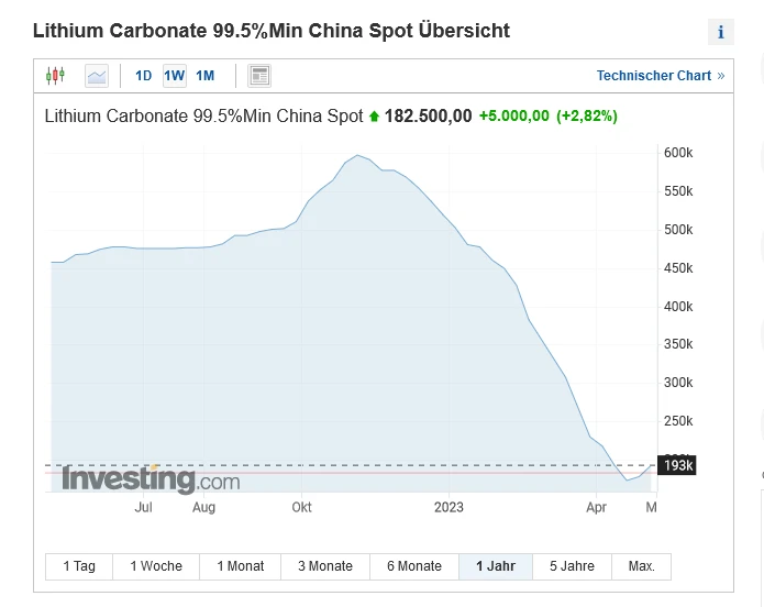Seit Anfang November sind die Preise für Lithium in den freien Fall übergegangen. Der Preis für den begehrten Batterie-Rohstoff hat in dieser Zeit am Tiefpunkt fast 70 Prozent an Wert verloren. Das derzeitige Jahrestief wurde Mitte April bei knapp 24.000 Dollar erreicht. Von da an hat der Preis knapp sechs Prozent zugelegt – ist das die Trendwende?