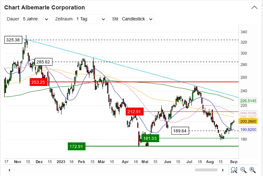 Albemarle ist Mitglied im DER AKTIONÄR Best of Lithium Index und hat dort hinter Sociedad Química y Minera de Chile die zweithöchste Indexgewichtung. Bei den mitunter sehr volatilen Lithium-Aktien kann es Sinn machen, die Risiken auf mehrere Schultern zu verteilen, Anleger können dies mit dem Indexzertifikat WKN DA0AAS tun.