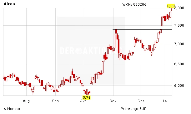 Nachdem der Aktienkurs von Alcoa über Monate hinweg immer weiter verloren hat, hat sich der Wert zuletzt eindrucksvoll zurückgemeldet. Seit Anfang Oktober, als Alcoa bei 5,80 Euro notierte, kletterte die Aktie zuletzt auf 8,00 Euro. Angesichts der starken charttechnischen Verfassung und der sich fortsetzenden Erholung der Wirtschaft können risikobereite Anleger durchaus wieder über eine erste Position nachdenken.