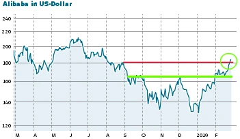Alibaba marschierte am Montag um weitere 3,5 Prozent nach oben und schloss bei 183,25 Dollar auf dem höchsten Stand seit sechs Monaten. Seit Jahresbeginn notiert die Aktie von Chinas größtem E-Commerce-Unternehmen 34 Prozent im Plus.