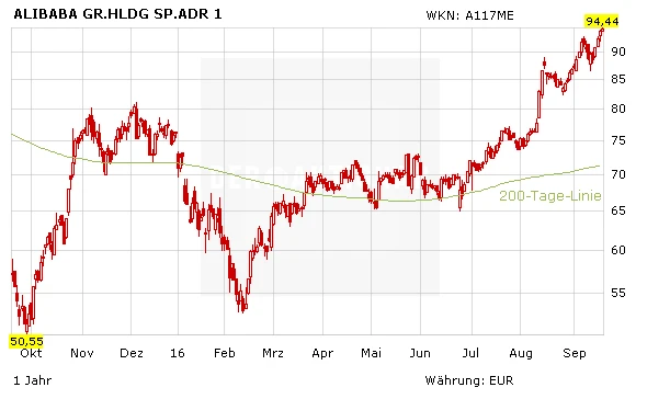 DER AKTIONÄR empfahl Alibaba vor genau einem Jahr September 2015 zu einem Kurs von 59 Euro. Die Aktie legte seitdem um 60 Prozent zu und lässt auf weitere Kursgewinne hoffen. Das Kursziel liegt bei 110 Euro.