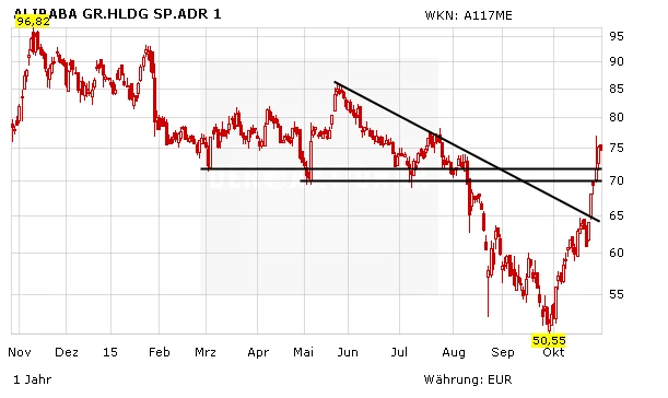 Der Oktober dürfte den Alibaba-Aktionären große Freude bereitet haben. Nachdem es für den Titel seit November 2014 steil abwärts ging und das Papier fast 50 Prozent verlor, gelang nun die Trendwende. Die Aktie legte über 40 Prozent zu. Für einen kräftigen Schub sorgten die am Dienstag veröffentlichten Quartalszahlen. Die Analysten zeigten sich von den Ergebnissen begeistert.